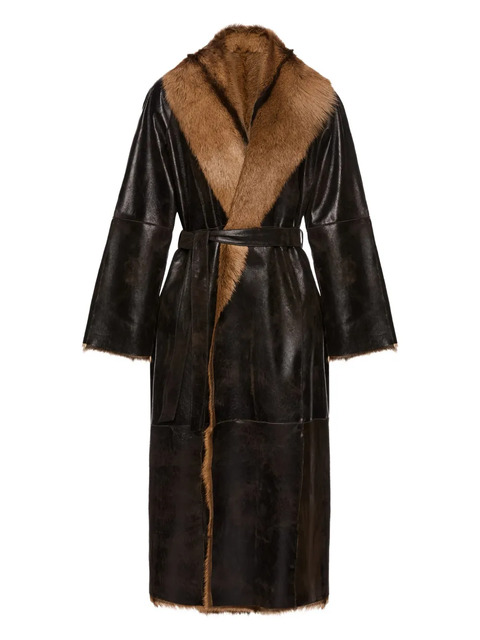 brown belted panelled design shawl collar long sleeves