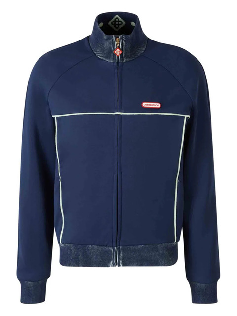 navy blue high collar front zip fastening long sleeves striped ribbed trims logo patch