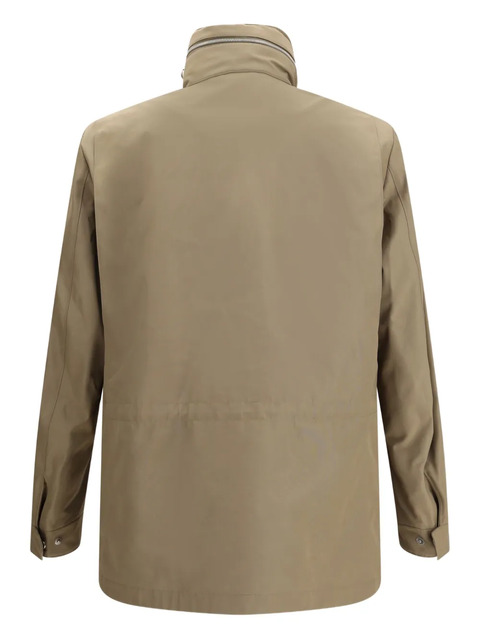 light brown high collar double-slider zip closure snap-button placket four flap welt pockets removable sleeve adjustable cuffs
