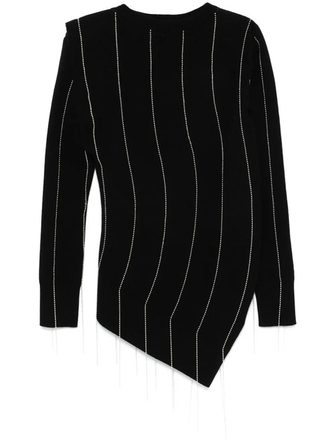 black wool knitted construction chalk stripe pattern bead detailing crew neck long sleeves ribbed cuffs and hem fringe detailing asymmetric hem
