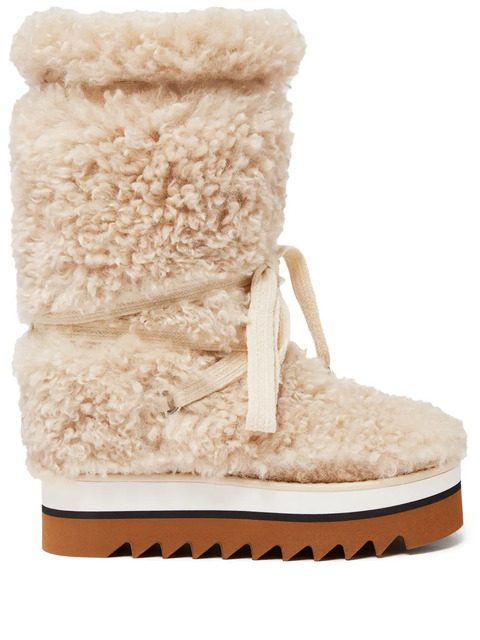 ecru faux shearling panelled design front lace-up fastening jacquard logo motif mid-calf length round toe branded insole full lining flat rubber sole