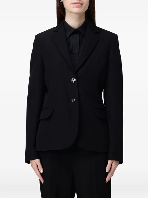 black button fastening front flap pockets long sleeves buttoned cuffs notched lapels