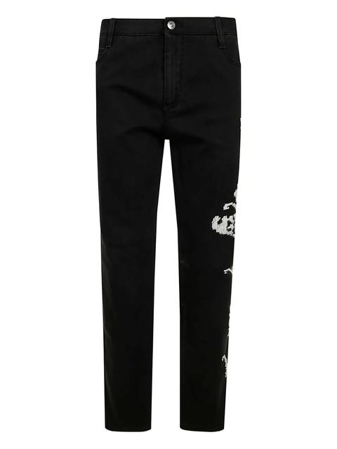 black floral embroidery five pockets belt loops button fastening rear logo patch