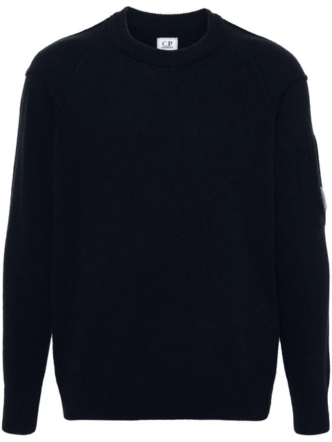 oxford blue wool blend ribbed knit inside-out effect seams signature Lens detail crew neck long sleeves sleeve zip pocket ribbed cuffs and hem straight hem authenticity QR code C.P. Company suggests removing any detachable accessories before washing.
