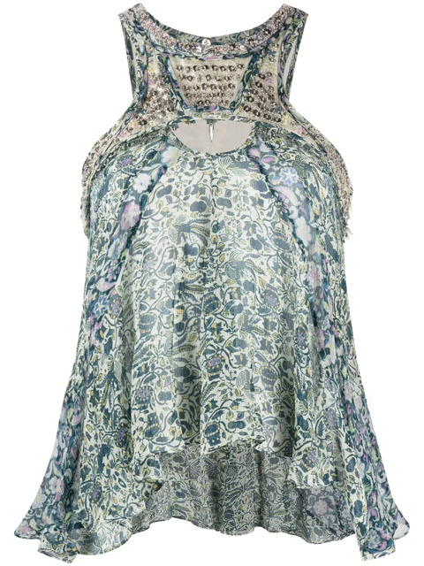blue silk semi-sheer construction mix print draped detailing cut-out detailing round neck single rear button fastening sleeveless lettuce hem