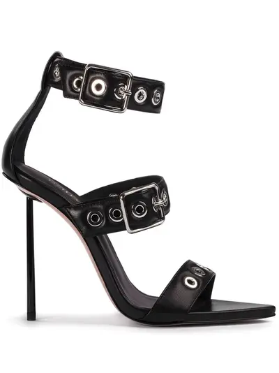 black nappa leather eyelet embellishment buckle-fastening ankle strap open toe high stiletto heel silver-tone hardware