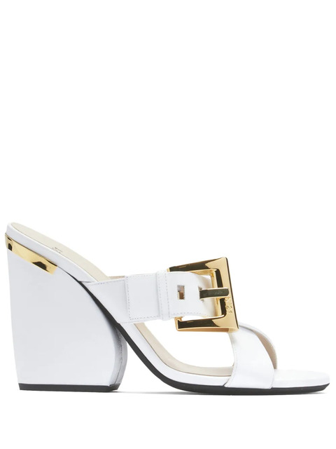 chalk white goatskin smooth grain gold-tone logo plaque logo-engraved buckle crossover strap at the toe round open toe slip-on style branded leather insole 100mm wedge heel leather sole