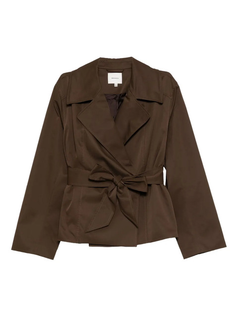 chocolate brown front button fastening two side inset pockets detachable adjustable waist strap long sleeves