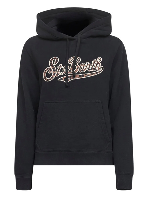blue adjustable drawstring hood leopard embroidered kangaroo pocket ribbed cuffs and hem