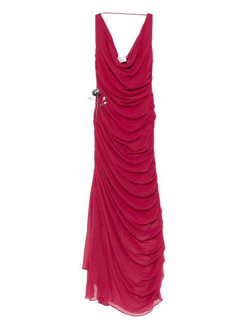 red floral appliqué draped detailing sleeveless cowl neck ruched