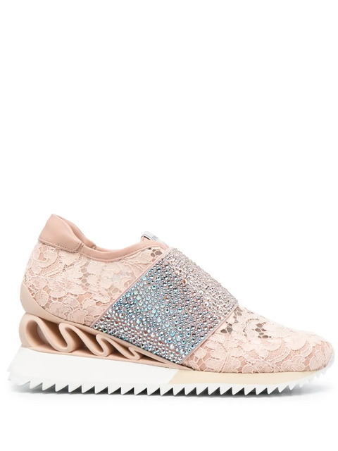 pink leather signature wave-wedge lace detailing crystal embellishment ridged rubber sole logo patch at the tongue