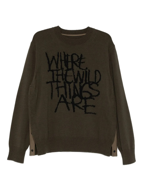 khaki green wool text print round neck long sleeves ribbed knit trim