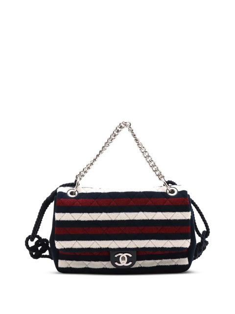 quilted striped jersey body chain link handle rope strap front flap with a CC turn-lock closure interior zip pocket blue Serial Number: 27110572 Inclusions: box, authenticity card, dust bag. Condition: EXCELLENT. This previously owned item is in near-perfect condition with no signs of damage or use. Due to the exclusivity of this item and its limited availability, processing and delivery might take longer than usual. Please refer to the photos on this product page for a detailed view of the item, including any damages declared.