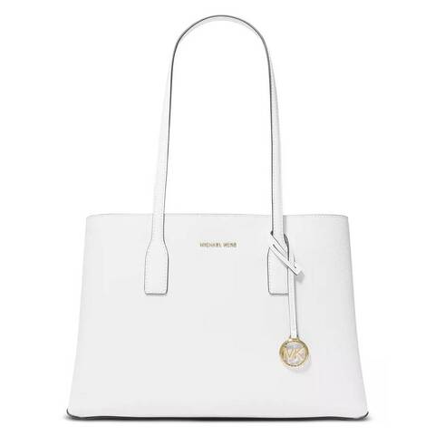 Michael Kors Ladies Tote. SKU: 30S4G9RT2T-085. Color: Optic White. Size: 13.75W x 10H x 4.75D. Michael Kors Ruthie Medium Pebbled Leather Tote Bag. The Ruthie tote, crafted from pebbled leather in a relaxed silhouette, is a polished and versatile carryall perfect for any occasion. It features a spacious, pocketed interior with a center zip compartment and rests on four silver-tone feet for a structured base. Designed for hands-free convenience, it has a 10 handle drop, snap fastening, and is lined with 100% polyester.