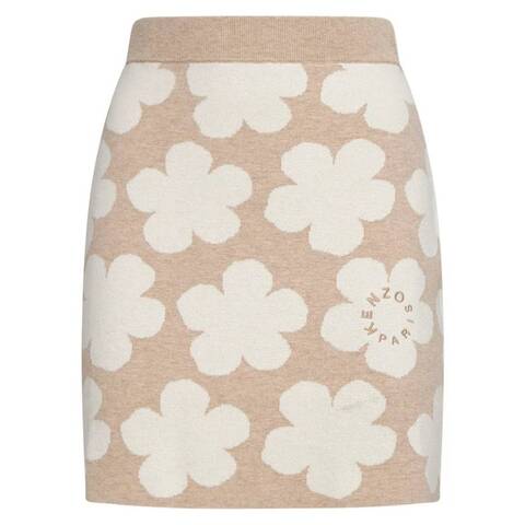 Kenzo Ladies Bottoms. Fashion category: Skirts. SKU: FE62JU4623CN.11. Color: Beige. Kenzo Floral Detailed Knitted Mini Skirt. Crafted from a soft wool-cotton blend, the 'HANA Dots' mini skirt features a playful dotted motif paired with subtle texture and structure. Finished with the iconic KENZO Paris signature embroidery, it blends feminine flair with the brand's contemporary edge. 52% Wool, 43% Cotton, 5% Elastane.