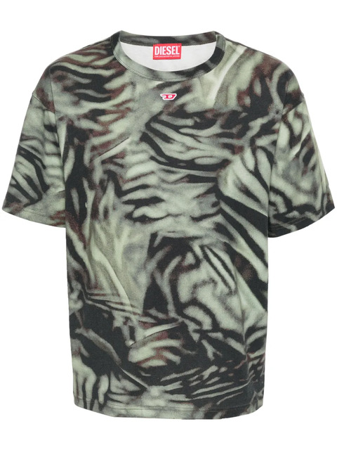 green/black jersey texture zebra-camo print crew neck short sleeves logo patch to the front Spiralling Out of Control print to the rear straight hem