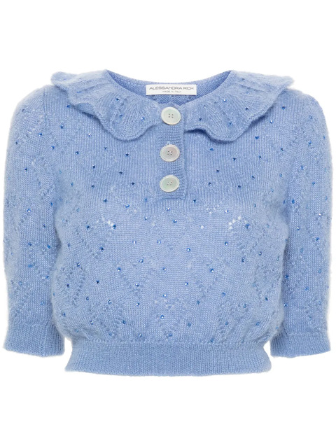 light blue mohair blend pointelle knit brushed finish glass crystal embellishment ribbed trim scallop collar front button placket short sleeves straight hem cropped
