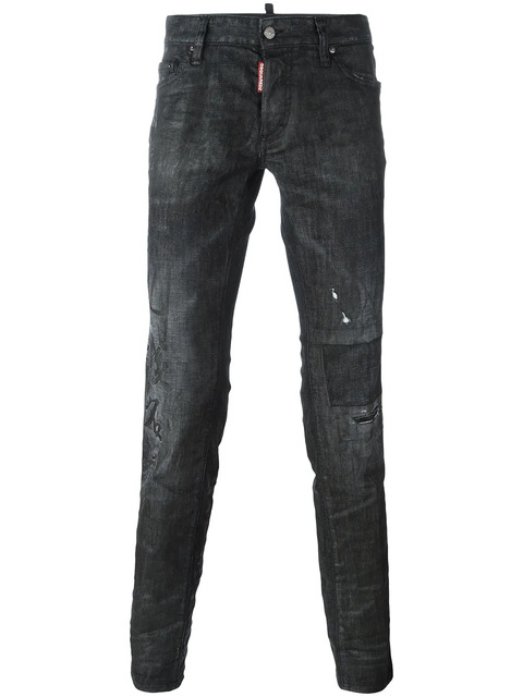 Black cotton blend 'Clement' jeans from DSQUARED2 featuring a front button fastening, a waistband with belt loops, a five pocket design, distressed effects, a bleached effect, a branded rear patch and a regular length.
