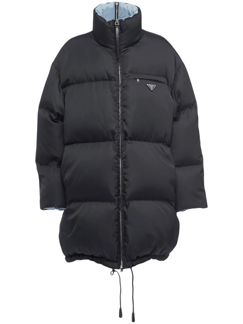 Re-Nylon high-neck puffer coat from PRADA featuring black/blue, recycled nylon, down-feather filling, padded design, silver-tone hardware, engraved logo, enamel triangle logo, high neck, front zip fastening, rear zip fastening, long sleeves, drawstring hem, zip-fastening chest pocket and two side zip-fastening pockets. .