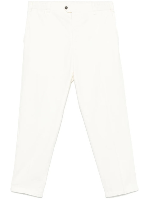 cream white cotton-cashmere blend stretch-design concealed fly and button fastening elasticated waistband belt loops two side slash pockets pressed crease two rear flap pockets turn-up hem full-length tapered leg