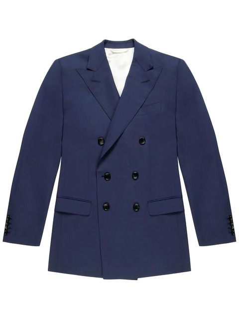 navy blue mohair notched lapels double-breasted button fastening two front jetted pockets long sleeves straight hem