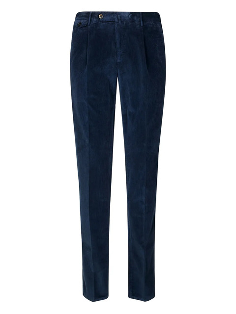 navy blue corduroy texture button fastening belt loops single pleat buttoned back pocket