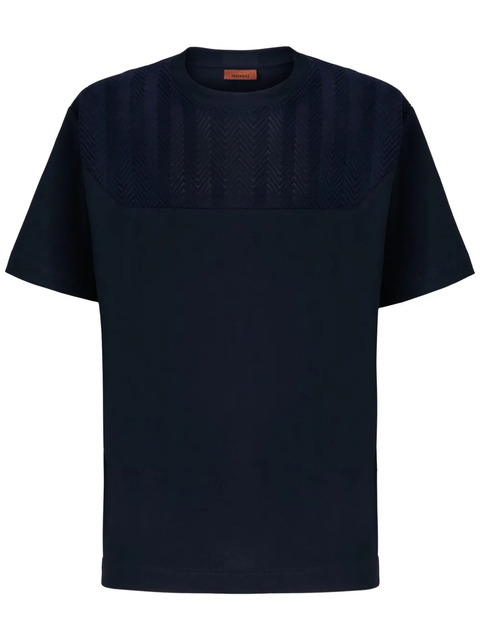 navy blue cotton jersey texture signature zigzag woven insert crew neck short sleeves straight hem The item you receive may differ slightly from the item photographed. This is due to the artisanal nature with which all Missoni products are constructed.