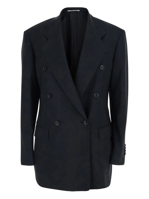 black notched lapels shoulder pads front button closure front flap pockets buttoned cuffs