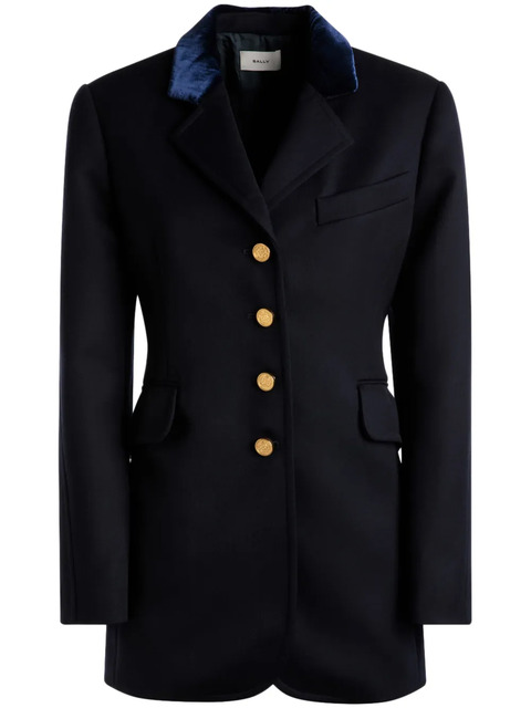 midnight blue wool logo-engraved buttons contrasting collar notched lapels front button fastening long sleeves buttoned cuffs chest welt pocket two front flap pockets straight hem