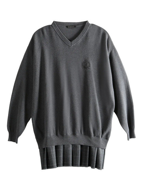 heather grey V-neck long sleeves ribbed hem pleated skirt logo detail