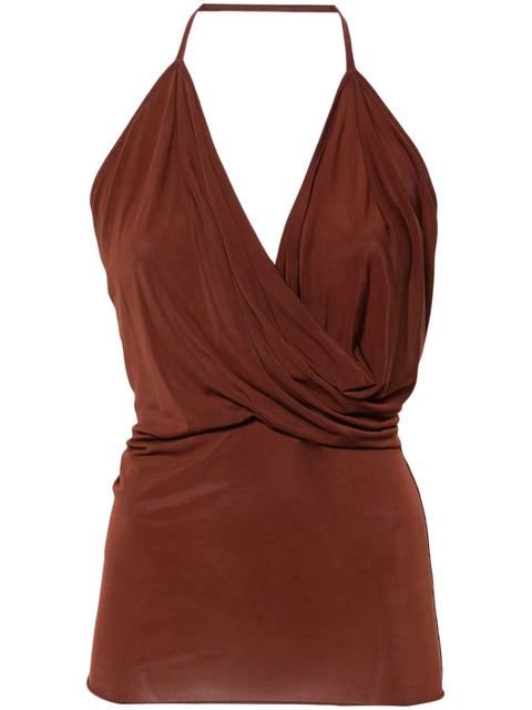 henna brown stretch-jersey draped design halterneck sleeveless V-neck with cowl effect open back unlined straight hem