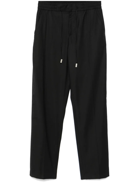 black virgin wool blend hook and zip fly fastening elasticated drawstring waistband pressed crease two diagonal pockets to the sides two rear jetted pockets straight leg