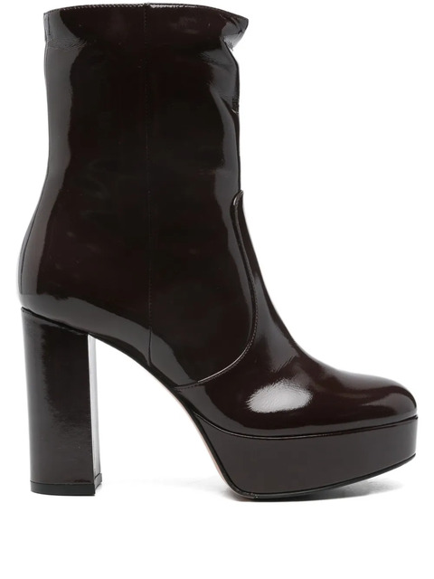 brown platform sole block heel side zip fastening ankle length glossy finish