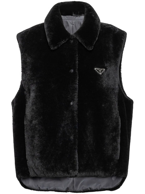 black sheepskin/shearling reversible enamel triangle logo pointed flat collar front press-stud fastening sleeveless rear curved hem zip-fastening chest pocket two side slit pockets