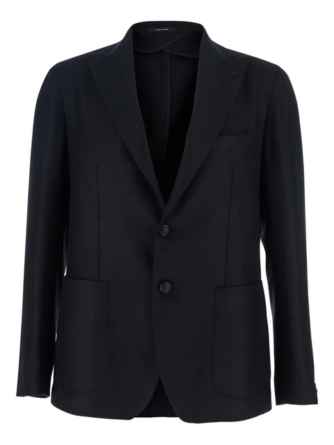 black two-button fastening peak lapels patch pockets buttoned cuffs chest welt pocket