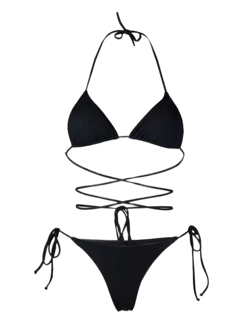black triangle top cross-front straps tie-side bottoms Be mindful to try on swimwear over your own garments.