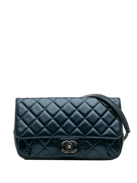 quilted calfskin body leather woven chain straps front flap with interlocking Cs closure with pleated front exterior interior zip and slip pockets blue Serial Number: 22081358 This item has no inclusions. Condition: GOOD. This previously owned and used item is in good condition with minimal signs of use. This may include fading of material or plating and scratches. Please refer to the photos on this product page for a detailed view of the item, including any damages declared.