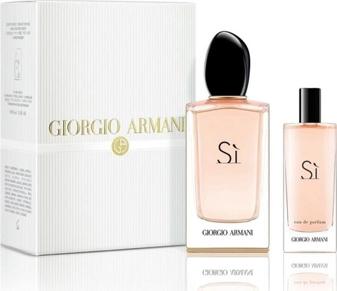 Launch year: 2013. Fragrance Family: Chypre Fruity. Top notes: Sicilian bergamot, Mandarin, Blackcurrant liqueur. Heart notes: Rose de Mai, Neroli, Egyptian jasmine, Freesia. Base notes: Patchouli, Woods, Amber, Orcanox, Vanilla. Design house: Giorgio Armani. Design house category: fashion. Design house country: Italy. Scent name: Si. Gender: Ladies. Category: Fragrance. SubType: Gift Set. Barcode: 3660732667048. Eau de Parfum 100 + 15ml. Giorgio Armani Ladies Si Gift Set Fragrances 3660732667048. <br/><br/> This item is only valid for shipment in the Contiguous United States & Canada.