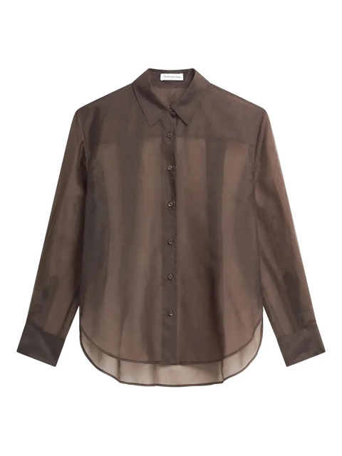 brown button fastening long sleeves sheer finish classic collar curved hem