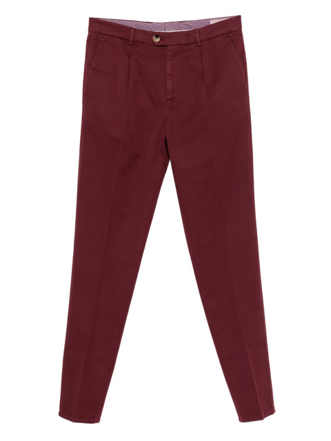 burgundy button fastening belt loops front pleats side seam pockets rear welt pockets
