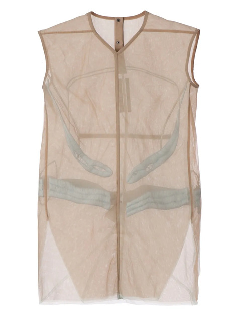 Sand embroidered sheer dress from Rick Owens featuring cap sleeves, a v-neck, a press stud fastening and side slits.