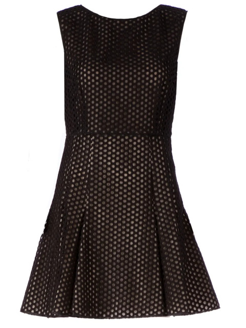 Black silk and wool blend mesh dress from Giambattista Valli featuring a round neck, a sleeveless design, a perforated detail, a flared style and pleated details.