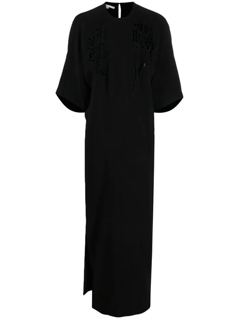 black stretch-design broderie anglaise floral motif crew neck drop shoulder concealed rear zip fastening short raglan sleeves side slit slight flare ankle-length