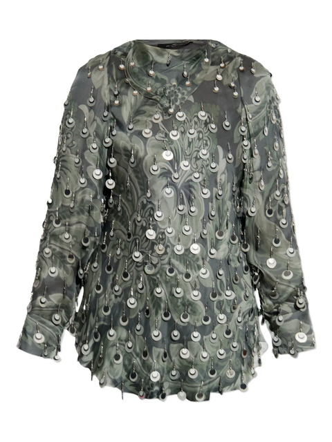 green floral pattern multiple embellishments mock neck long sleeves silk