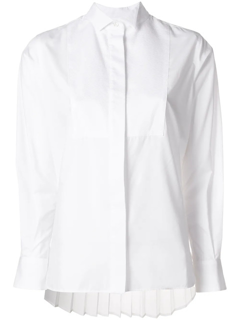 The Sacai aesthetic is an experimental mix of contrasting fabrics, unique silhouettes and unexpected references. Chitose Abe spent many years working as a pattern-cutter under Rei Kawakubo, which the designer claims taught her the importance of creating original pieces that are innovative yet timeless and can be worn for any occasion. This white cotton blend pleated back shirt from Sacai features a pointed collar, a concealed button fastening, long sleeves, button cuffs and a box pleat detail to the back.