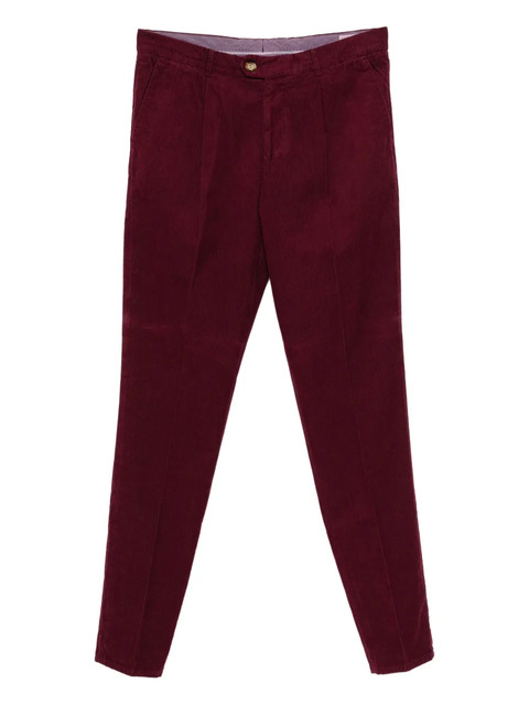 burgundy corduroy texture pleated front button fastening belt loops side seam pockets