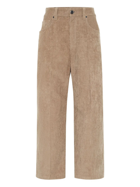 taupe corduroy texture belt loops button fastening square pockets rear patch pockets