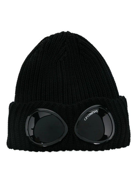 black wool ribbed knit signature Goggles detail curved peak turn-up brim C.P. Company suggests removing any detachable accessories before washing.