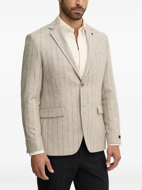 beige pinstripe button fastening notched lapels front flap pockets chest welt pocket