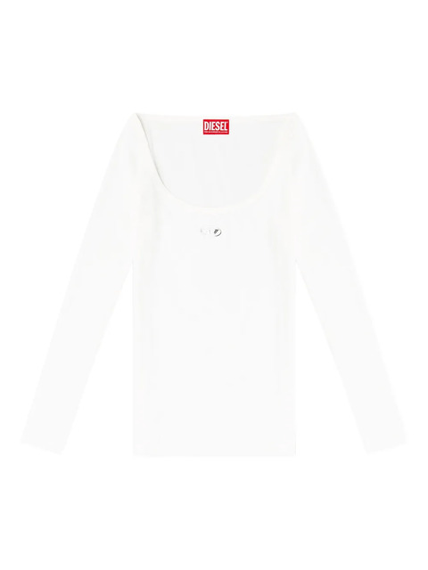 white ribbed texture wide round neckline long sleeves overlock seams logo detail
